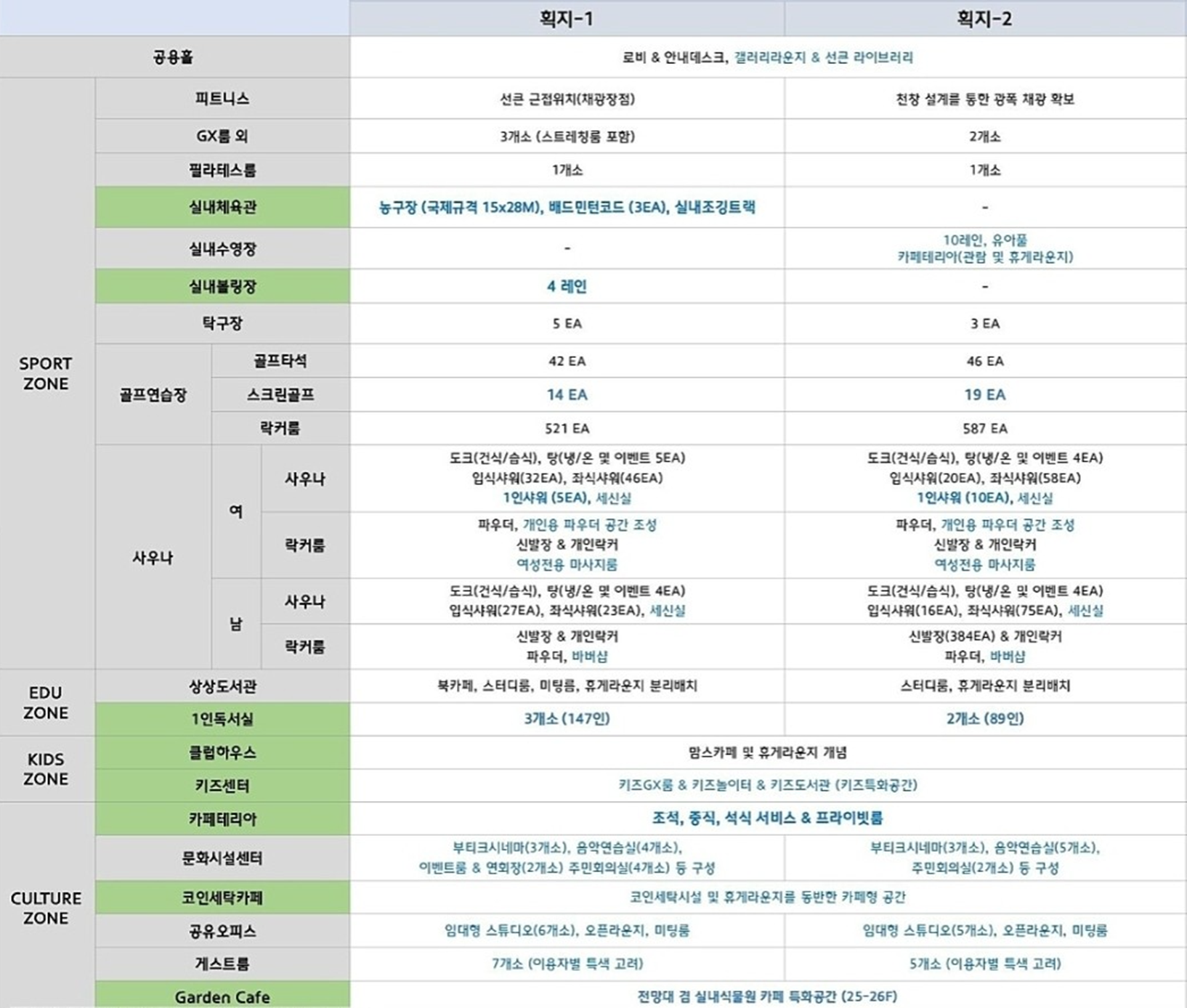 커뮤니티시설은 스포츠, 도서관, 어린이, 문화시설로 크게 4개의 카테고리로 나뉘져 있습니다. 이 중 스포츠시설을 제외 나머지 시설은 1 획지 2 획지 구분 없이 동일하게 시설이 조성됩니다. 스포츠 시설 역시 농구장, 실내수영장, 실내볼링장 시설 정도면 차이가 있을 뿐 골프, 사우나 등 필수적인 시설은 양쪽 모두 조성이 됩니다.