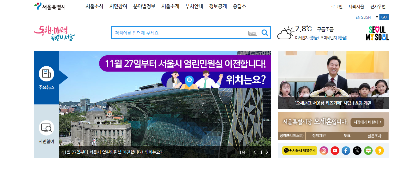 동행 매력 특별시!! 서울시청 메인 홈페이지입니다.