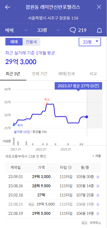 최근 실거래가는 10월 59타입이 29억(18층)에 거래가 되었으며 현재는 27억에 최저호가로 나와있습니다.