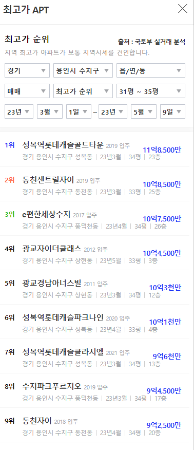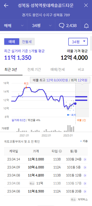 국토교통부 실거래가에 따르면 수지구 대장 아파트인 성복역롯데캐슬골드타운은 지난달 전용 84㎡B형이 11억3000만원에 매매가 이뤄졌습니다. 2021년 2월 기록했던 최고가(14억9500만원) 대비 2년여 만에 4억3500만원이 하락했지만, 최근 호가는 11억 중후반~12억원대에 분포되어 있습니다. 최근 11억에 거래되었던 매매계약은 취소까지 이뤄지고 있는 상황입니다.