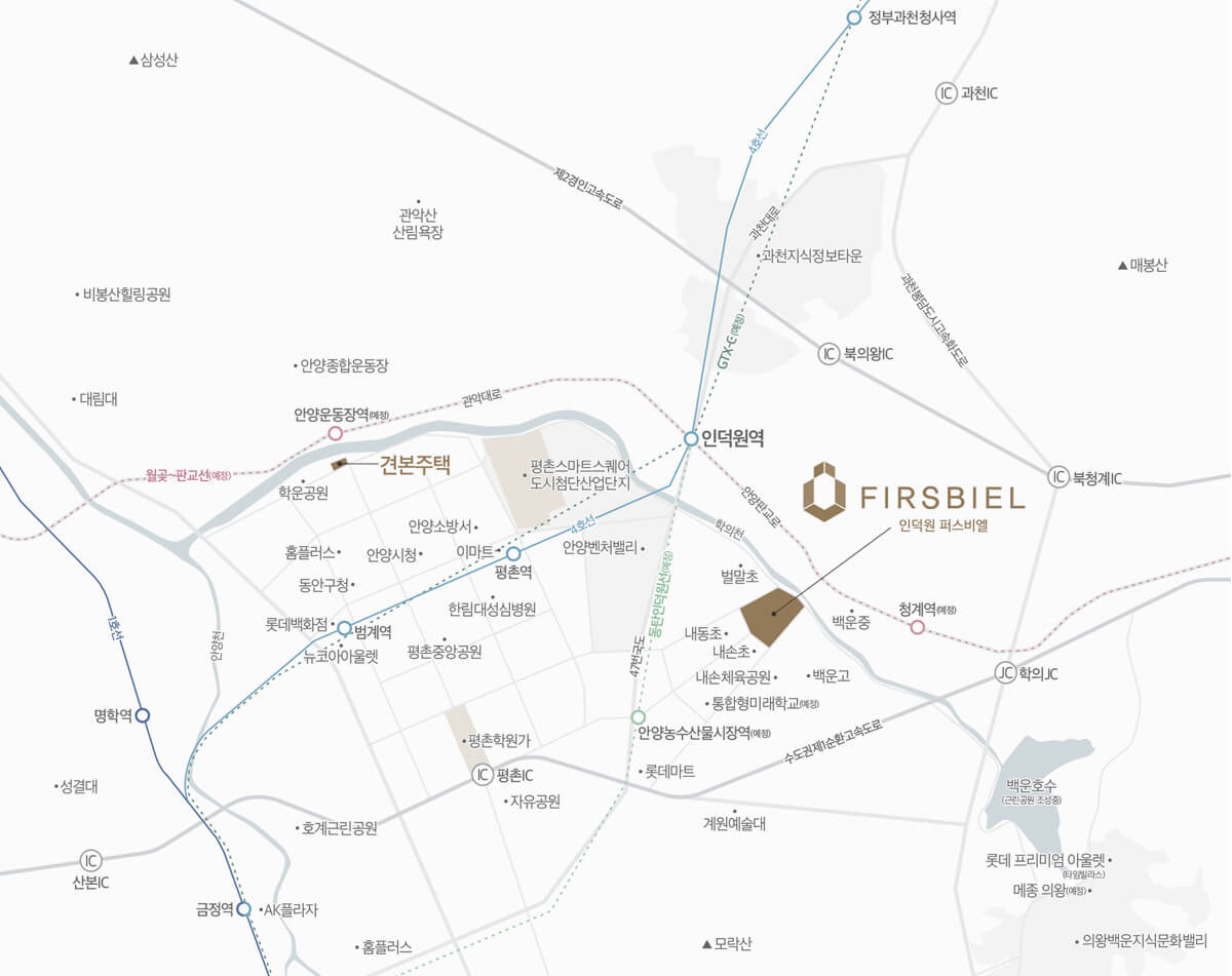 인덕원 퍼스비엘은 이름에서 알 수 있듯이 인덕원역 호재에 절대적인 영향을 받는 지역입니다. 물리적인 거리로 보면 도보로 이용은 어렵지만 향후 GTX와 월판선이 개통 예정에 있어 상당한 호재로 작용할 전망입니다.