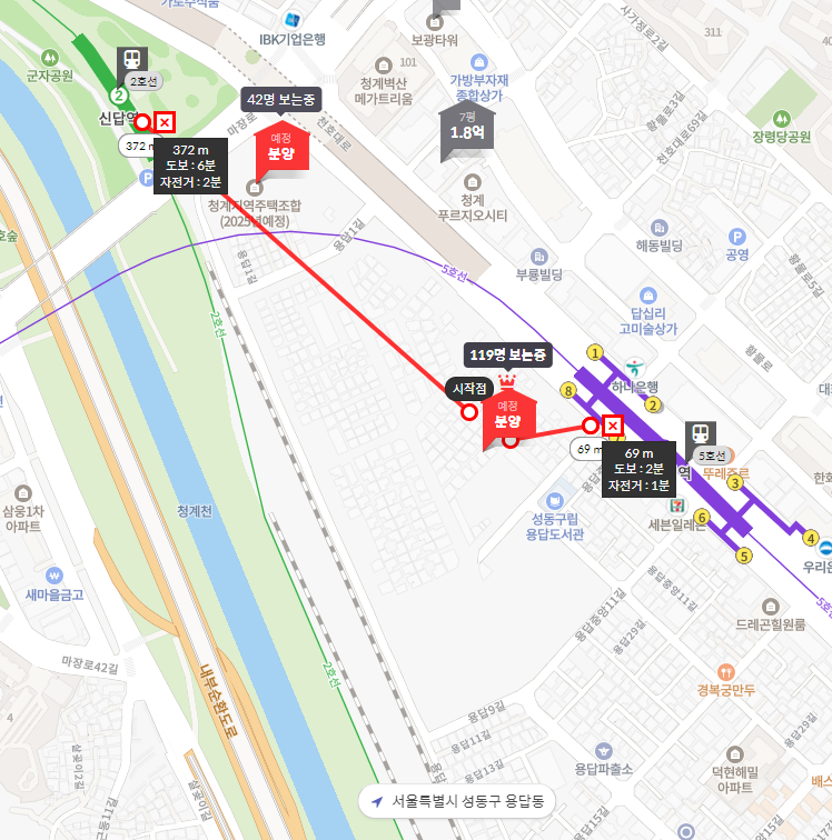 청계리버뷰자이의 교통여건은 최상위권 입지로 5호선과 2호선 더블 역세권으로 5호선 답십리는 단지에서 100M가 채 되지 않는 정말 코 앞에서 지하철을 이용할 수 있습니다.