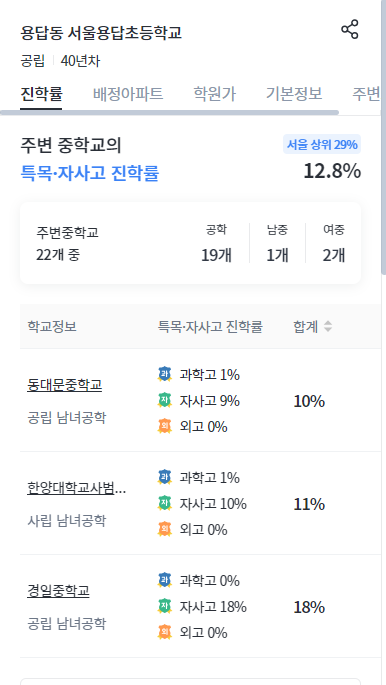용답초등학교의 진학형태를 보면 동대문중, 한양대 사범중, 경일중으로 대표되며 각 학교의 특목고, 자사고 진학률은 평이한 수준으로 보여집니다.