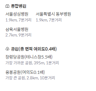 청계리버뷰자이의 상권 인프라는 매우 좋아 보입니다. 단지에서 2km 이내 차로 5분 거리로 이마트, 엔터식스, 홈플러스 롯데마트 등 주요 쇼핑몰이 입점하고 있으며 종합병원 역시 삼육병원, 서울시립병원, 서울 성심병원이 인접해 있어 편리한 생활을 누릴 수 있을 것으로 보입니다.