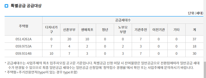 공급 물량중 특별공급은 대상은 총 85세대이며 각각의 기준에 부합하는 조건들을 잘 살펴보시고 청약 신청을 하시기 바랍니다.